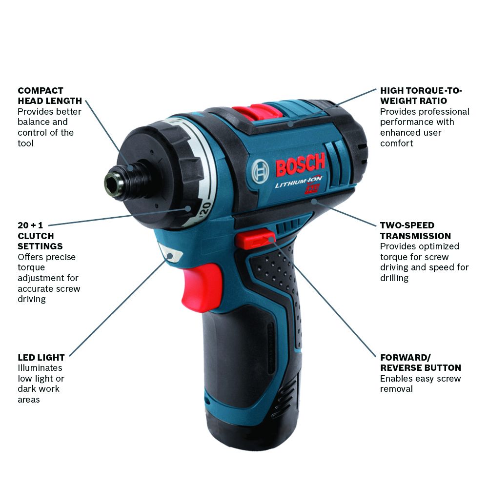 This 12V Max two-speed pocket driver is a professional-grade tool that provides real power at an unreal size. The Bosch PS21 features a professional motor that delivers 265 In.-Lbs. of torque, along with a max speed of 1,300 rpm. With a head length of 5.6 In. and a weight of 1.4 Lbs. (tool only, not including battery), this compact powerful pocket driver is an ideal tool for overhead work or tight spaces. The 1/4 In. hex quick-change chuck provides enhanced bit grip. It provides two-speed transmission and 20+1 clutch settings, for more precise operation. It has an LED light to illuminate dark work areas. This is a bare tool kit; the battery and charger are sold separately.