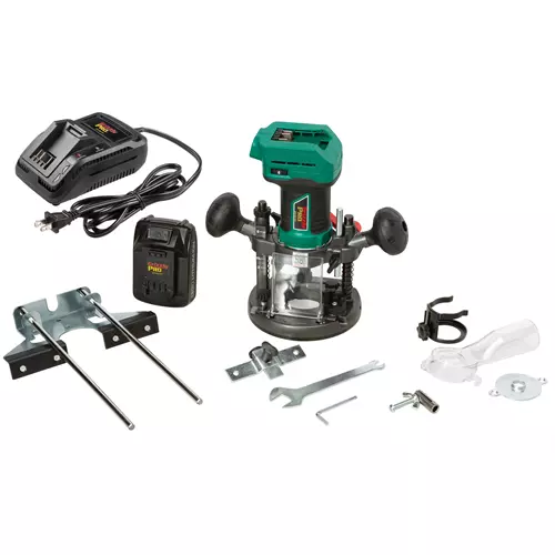Like all Grizzly PRO tools, the Grizzly PRO Plunge Router is powered by a low profile and incredibly lightweight 2.0Ah Lithium-Ion battery for all-day performance. One T30304 2.0Ah Lithium-Ion Battery is included in this kit. These batteries can be used on all the Grizzly PRO hand power tools and are easily charged with the included 2.4A Fast Charger.